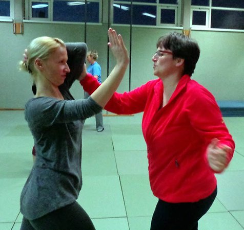 „Ich höre nichts! Ihr müsst laut und forsch rufen, auch damit eventuelle Zeugen aufmerksam werden“, fordert Thieme die Frauen auf, auch im Training aus sich herauszugehen. „Was sind Rettungsinseln?“ fragt er weiter. „Geschäfte“, „Gaststätten“, „Bushaltestellen“, kommt es von den Frauen zurück, die zugleich üben, sich durch geschickte Drehungen oder Fingerhebeln aus Umklammerungen zu befreien.